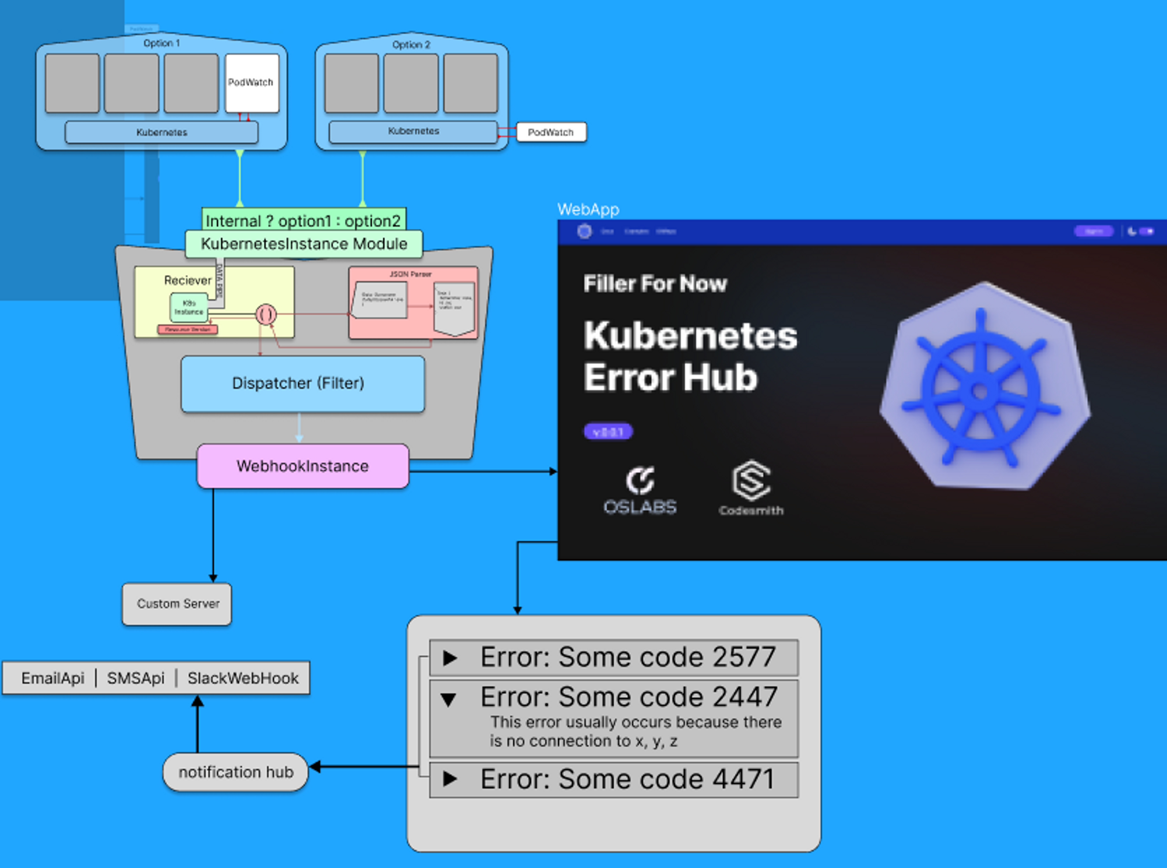 The Watcher Service would have a simple job - receive information form the cluster Events API about the status of the cluster and its pods, and relay that information outwards as a webhook. We decided that we would allow the user to decide if the information would be sent to our own PodWatch Web Service, or relayed to their own custom server where they could process the information however they see fit.